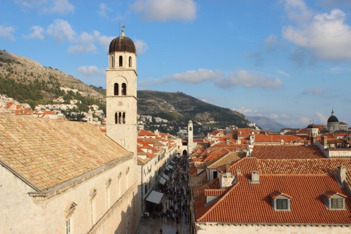 Abriéndose paso por los angostos pasajes y entre la apabullante cantidad de visitantes, la guía de unos 35 años va acarreando a su grupo hasta una esquina donde se detiene y apunta al piso: “esto que ven aquí son huellas de esquirlas de cuando los serbios bombardearon Dubrovnik”, le dice a los 10 argentinos que esta vez la acompañan.