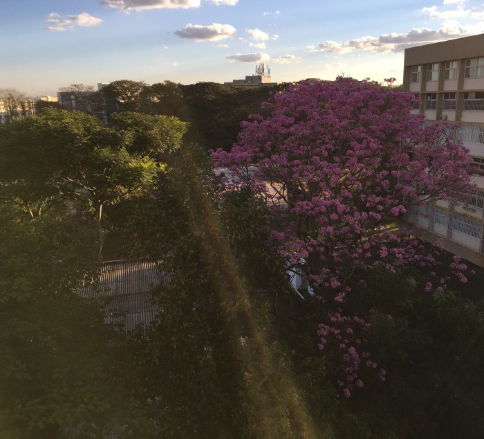 Desde la ventana, este es el ipacho florido que las maritacas y yo contemplamos. Este texto lo escribí en junio (el mismo día que tomé esta foto) Ahora lo publico en julio, cuando la seca ha dejado al árbol ya totalmente desnudo, para tristeza mía y de las maritacas.