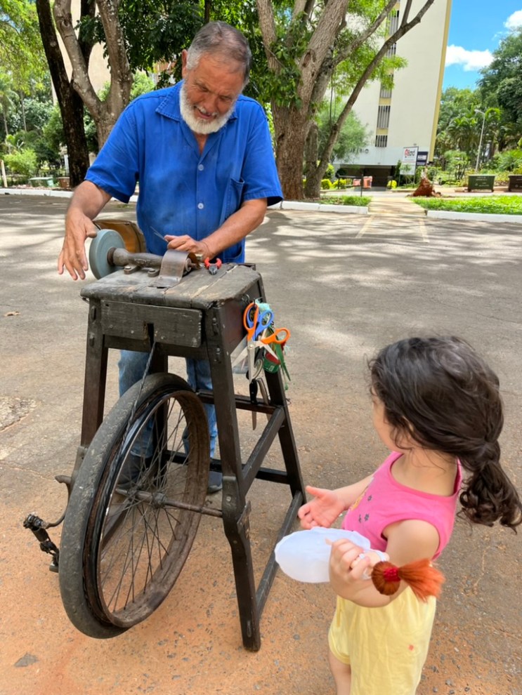 En seguida se puso a lo suyo y con paciencia nos fue explicando la ingeniería de su vieja máquina, la cual él mismo había mandado a construir hacía 43 años; esos eran todos los años que Don Osmar llevaba afilando cuchillos y tijeras por todo Brasil. “Esta vez me quedé 40 días en esta ciudad, vine de Belo Horizonte y mañana regreso a São Paulo. Solo volveré a Brasilia después de un año”, explicaba mientras Violeta y yo mirábamos hipnotizadas cómo con el pie empujaba un pedal que hacía rodar una rueda de bicicleta que a la vez ponía en movimiento la piedra de afilar.