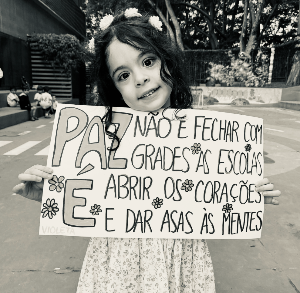 Hoy Violeta se vistió de blanco y caminó todo el trecho desde su casa hasta su escuela ostentando una pancarta donde su mamá escribió: “Paz no es cerrar con rejas las escuelas, paz es abrir los corazones y dar alas a las mentes”. Con tan solo 4 años, y sin saberlo, Violeta caminaba haciéndole frente al terror que se ha apoderado del barrio, de la ciudad y del país donde ella vive.